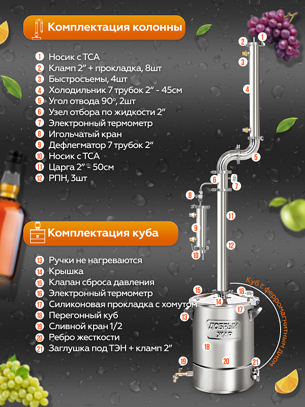 Пришло немного с разорванной коробкой, но аппарат не пострадал.Аппаратом доволен. На второй перегонке получил до 90 градусов. Пробовал гнать на плите и с ТЭНом. На плите получилось долго. С ТЭНом все отлично, ТЭН на 3 киловатта. Аппарат к покупке рекомендую. Диоптер докупал отдельно.